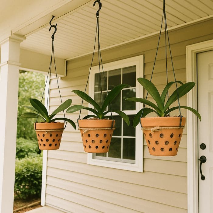 Hanging them also keeps them away from heavy rain. Too much water at once can stress orchids, so having them sheltered but still outdoors is the perfect balance.