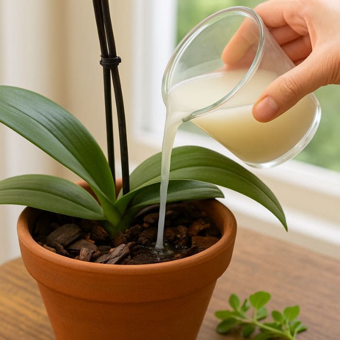 Every two or three weeks, I use diluted rice water. Rice water contains small amounts of nutrients and beneficial bacteria that help strengthen roots. I always dilute it so it doesn’t ferment or become too heavy.