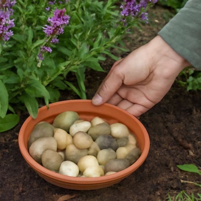 I used a shallow dish, filled it with water, and placed smooth stones inside so the bees had something to stand on. Bees can’t swim, so giving them safe landing spots is essential. I placed the waterer in a shaded corner of the flower bed where the water wouldn’t evaporate too quickly.