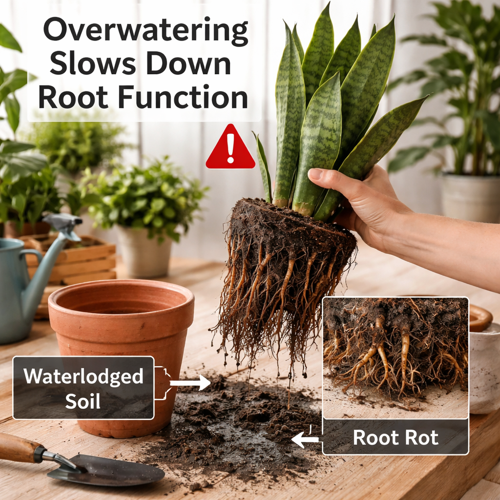 Snake plants prefer dry conditions, and excess moisture can weaken the roots over time. Even when the plant looks healthy, overwatering can reduce its ability to absorb nutrients, which directly affects growth.